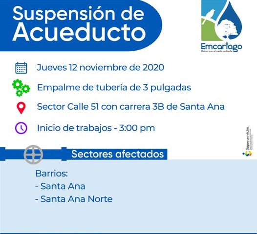Suspensión de acueducto. Hoy jueves 12 de noviembre a partir de las 3:00 pm debido a daño en tubería de 3 pulgadas en el Sector de la Calle 51 con Carrera 3B Santa Ana.