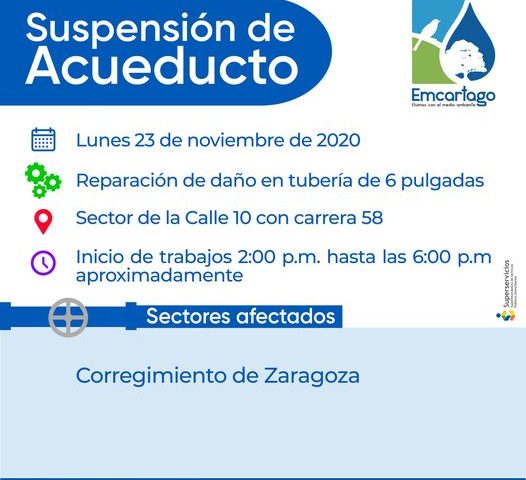 Suspensión del servicio de acueducto HOY lunes 23 de noviembre a partir de las 2:00 pm en el Corregimiento de Zaragoza, debido a la reparación de un daño en tubería de 6 pulgadas.
