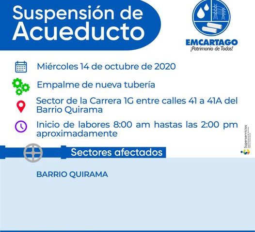 Suspensión de acueducto para este miércoles 14 de octubre por labores de empalme en el sector de la Carrera 1G entre calles 41 a 41A del Barrio Quirama.