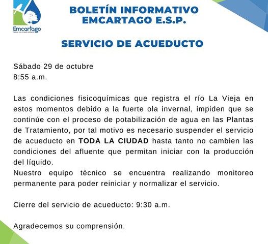 Suspensión de Acueducto en TODA LA CIUDAD, debido a las condiciones fisicoquímicas del río la Vieja ante la fuerte ola invernal.
