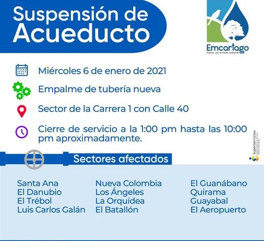 SUSPENSIÓN DEL SERVICIO DE ACUEDUCTO PARA ESTE MIÉRCOLES 6 DE ENERO
