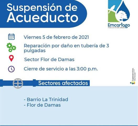 Suspensión del servicio de acueducto a partir de las 3:00 p.m. HOY viernes 5 de febrero, debido a daño en tubería de 3 pulgadas en el sector de Flor de Damas.