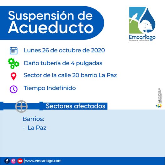 Suspensión del servicio de acueducto a esta hora en el sector de Talleres de Emcartago debido a daño en tubería de 2 pulgadas.