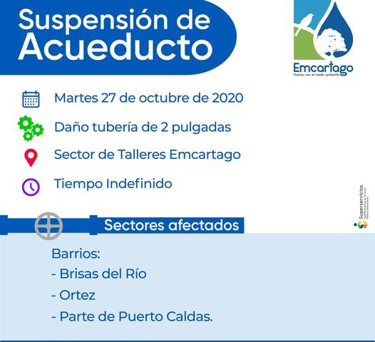 Suspensión del servicio de acueducto a esta hora en el sector de Talleres de Emcartago debido a daño en tubería de 2 pulgadas.