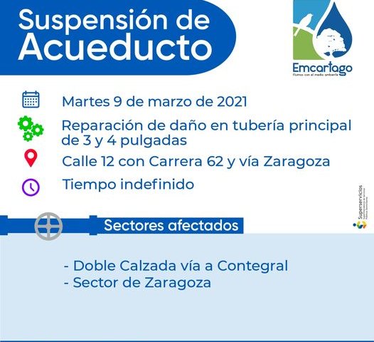 Suspensión del servicio de acueducto debido a daño en tubería de 3 y 4 pulgadas en el sector de Zaragoza.