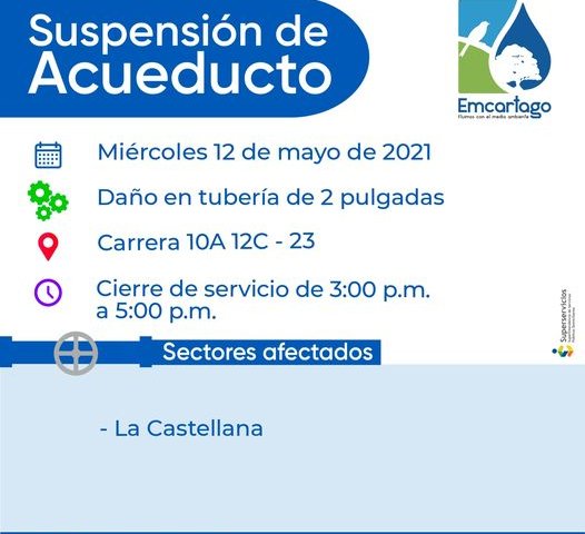 SUSPENSION ACUEDUCTO10 mayo, 2021CUMPLIENDO CON EL BRR EL GUAYABAL13 mayo, 2021 SUSPENSION ACUEDUCTO Publicado por Enlaza en 12 mayo, 2021 Categorías Boletines Suspensiones de Acueducto Suspensiones del Servicio Tags Suspensión del servicio de acueducto por daño en tubería de 2 pulgadas en el barrio La Castellana. Estos son los sectores afectados. Post Relacionados1 agosto, 2025ACCIONES PREVENTIVAS FENOMENO DEL NIÑOLeer Más1 agosto, 2025AMPLIACIÓN PLANTA DE TRATAMIENTO NO. 2Leer Más1 agosto, 2025BAJA PRESIÓN DEL ACUEDUCTO POR REPARACIONESLeer Más Deja una respuesta Cancelar la respuestaTu dirección de correo electrónico no será publicada. Los campos obligatorios están marcados con *Comentario * Nombre Correo electrónico Web Guarda mi nombre, correo electrónico y web en este navegador para la próxima vez que comente. Δ