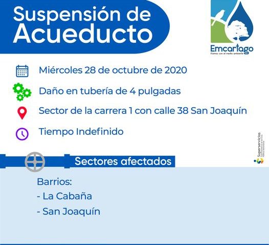 SUSPENSION ACUEDUCTO27 octubre, 2020SUSPENSION ACUEDUCTO29 octubre, 2020 SUSPENSION ACUEDUCTO Publicado por Enlaza en 28 octubre, 2020 Categorías Boletines Suspensiones de Acueducto Suspensiones del Servicio Tags Suspensión de acueducto debido a daño en tubería de 4 pulgadas en el sector de San Joaquín. Estos son los sectores afectados. Post Relacionados1 agosto, 2025ACCIONES PREVENTIVAS FENOMENO DEL NIÑOLeer Más1 agosto, 2025AMPLIACIÓN PLANTA DE TRATAMIENTO NO. 2Leer Más1 agosto, 2025BAJA PRESIÓN DEL ACUEDUCTO POR REPARACIONESLeer Más Deja una respuesta Cancelar la respuestaTu dirección de correo electrónico no será publicada. Los campos obligatorios están marcados con *Comentario * Nombre Correo electrónico Web Guarda mi nombre, correo electrónico y web en este navegador para la próxima vez que comente. Δ