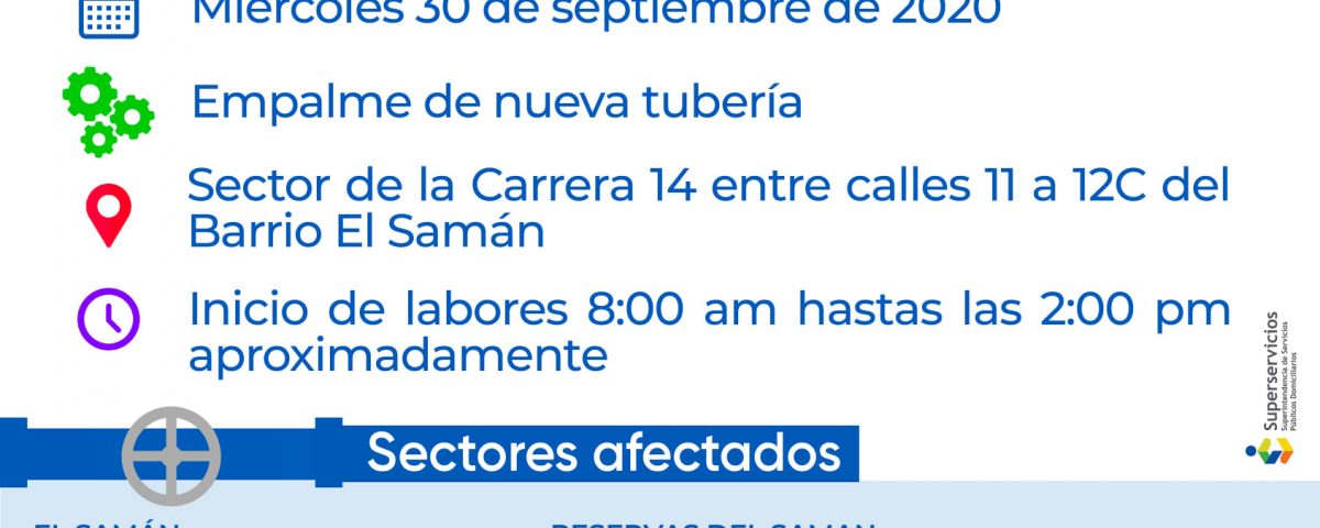 Suspensión de acueducto este MIÉRCOLES 30 de septiembre por labores de empalme en el sector de la de la Carrera 14 entre calles 11 a 12C del Barrio El Samán.